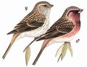 描述:中等体型(15厘米)的朱雀。上体褐色斑驳,眉纹、脸颊、胸及腰淡紫粉,臀近白。雌鸟无粉色,但具明显的皮黄色眉纹。雄雌两性均甚似体型较小的曙红朱雀,但嘴较粗厚且尾的比例较长。亚种waltoni粉色较其他亚种为淡。