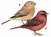 描述:体型略小(15厘米)的深色朱雀。雄鸟:全身深绯红色,腰色较淡,眉纹及三级飞羽羽端浅粉色。较其他朱雀色深;较点翅朱雀体小;较暗胸朱雀或曙红朱雀喉色深。雌鸟:橄榄褐色而具深色纵纹;三级飞羽羽端浅皮黄色而有别于暗胸朱雀或赤朱雀。