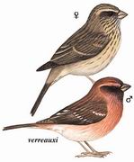 描述:中等体型(15厘米)的深色朱雀。繁殖期雄鸟具浅粉色的长眉纹,腰及下体暗粉色,特征为三级飞羽及覆羽具浅粉色点斑。雌鸟无粉色且纵纹密布,下体淡皮黄,眉纹长而色浅。三级飞羽浅色羽端有别于玫红眉朱雀及红眉朱雀的雌鸟。亚种vinaceus雌鸟的三级飞羽具浅色羽端但无浅色眉纹。亚种verreauxii较指名亚种体小而粉色较淡。