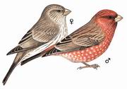 描述:体型甚大(19厘米)而壮实的朱雀。嘴大,两翼及尾长。繁殖期雄鸟的脸、额及下体深红,顶冠及下体具白色纵纹;颈背及上背灰褐而具深色纵纹,仅略沾粉色;腰粉红。雌鸟灰褐而密布纵纹。雄鸟与大朱雀的区别在整体红色不如其浓,颈背及上背褐色较重且多纵纹。雌鸟的区别为颈背、背及腰具纵纹,且褐色较重。亚种lucifer体型比指名亚种稍大。