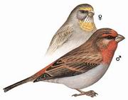 描述:体大(19.5厘米)而显厚重的雀。嘴粗厚。成年雄鸟的眉、脸下颊、颏及喉猩红色;上体红褐,腰栗,下体灰。雌鸟橄榄黄色取代雄鸟的红色,上体沾绿橄榄色,颏及喉灰。第一夏的雄鸟似成年雄鸟但橘黄取代红色。腹部灰色而非偏褐有别于红胸朱雀,且上体纵纹较少。雌鸟与血雀雌鸟的区别为额及胸侧黄色。