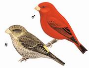 描述:体型略大(18.5厘米)而独具特色的红色或橄榄褐色的雀鸟。嘴厚重。雄鸟醒目,全身猩红一色,飞羽偏黑而羽缘红色。雌鸟:上体橄榄褐色,下体灰,具偏深色的杂斑,腰黄。雄性幼鸟似雌鸟但上体具棕色调,腰橘黄色较多。