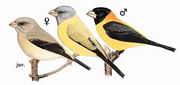 描述:体大(22厘米)且头大的黑黄色雀鸟。嘴特大。成年雄鸟头、喉、两翼及尾黑色,其余部位黄色。雌鸟头及喉灰,覆羽、肩及上背暗灰黄。雄性幼鸟似成鸟但色暗。与所有其他中国的蜡嘴雀的区别为颈背及领环黄色。