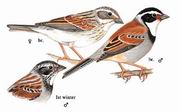 描述:体型略大(16厘米)而尾长的鹀。繁殖期雄鸟:头黑,白色的眉纹从鼻孔延至颈背,颈圈灰色,背栗而腰灰,颏及眼先栗色。特征为具白色的胸兜及黑色的项纹,下体灰而臀近白,具白色的横斑,飞羽黑色,羽缘色浅。雌鸟及非繁殖期雄鸟似繁殖期雄鸟但色暗且无黑色项纹,背栗色而具黑色纵纹,喉褐色具纵纹,眉线色浅而长。