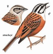 描述:体型略大(16厘米)的鹀。特征为头具灰色及黑色条纹,下体暖褐色。雌鸟似雄鸟但色暗。与戈氏岩鹀的区别在头部条纹黑色而非褐色,且头部的灰色甚显白。亚种stracheyi较小,下体色深,腰棕色较深。亚种stracheyi及par均具皮黄色的翼斑。
