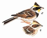 描述:中等体型(15厘米)的鹀。腹白,头部图纹为清楚的黑色及黄色,具短羽冠。雌鸟似雄鸟但色暗,褐色取代黑色,皮黄色取代黄色。与田鹀的区别在脸颊清褐色而无黑色边缘,且脸颊后无浅色块斑。亚种ticehursti较指名亚种色淡而上背纵纹窄;elegantula较指名亚种色深,上背、胸及两胁的纵纹粗且深。