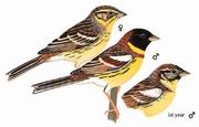 描述:中等体型(15厘米)而色彩鲜亮的鹀。繁殖期雄鸟顶冠及颈背栗色,脸及喉黑,黄色的领环与黄色的胸腹部间隔有栗色胸带,翼角有显著的白色横纹。亚种ornata额部多黑色,且比指名亚种色深。非繁殖期的雄鸟色彩淡许多,颏及喉黄色,仅耳羽黑而具杂斑。雌鸟及亚成鸟顶纹浅沙色,两侧有深色的侧冠纹,几乎无下颊纹,形长的眉味浅淡皮黄色。所有亚种均具特征性白色肩纹或斑块,以及狭窄的白色翼斑,翼上白色斑块飞行时明显可见。