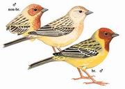描述:体型略大(16厘米)的偏黄色鹀。头上无条纹。成年雄鸟清楚易识,头及胸栗色而与颈圈及腹部的艳黄色成对比。部分雄鸟有较少的红色。非繁殖期雄鸟相似但较暗。雌鸟上体浅沙皮黄色,下体浅黄,头顶及上背具偏黑色纵纹。与黑头鹀雌鸟的区别为腰及臀黄,翼羽羽缘皮黄而非白色。幼鸟灰色较重,纵纹浓密且延伸至胸。