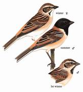 描述:体型略小(15厘米)的鹀。繁殖期雄鸟头黑,似芦鹀及苇鹀,但无白色的下髭纹,腰及颈背棕色。繁殖期雌鸟似雄鸟,头部图纹似雌芦鹀但区别为下体较少纵纹且色淡,颈背粉棕色,头顶及耳羽色较深。非繁殖期雄鸟似雌鸟但喉色深。