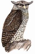 描述:体型硕大(63厘米)的偏褐色雕鸮。耳簇羽长而厚,近灰色的下体上由深褐色羽端生成特征性扇贝状鳞纹而非条纹。上体多深色杂斑但无条纹。眼褐、嘴黄也可为特征。