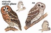 描述:中等体型(43厘米)的偏褐色鸮鸟。无耳羽簇,通体具浓红褐色的杂斑及棕纹,但也见偏灰个体。每片羽毛均具复杂的纵纹及横斑。上体有些许白斑,面庞之上有一偏白的"V"形。