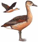 描述:中等体型(41 厘米)的红褐色鸭。头顶深褐,头及颈皮黄色,背褐而具棕色扇贝形纹,下体红褐。