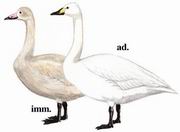 描述:较高大(142厘米)的白色天鹅。嘴黑但基部黄色区域较大天鹅?I献觳嗟幕粕怀汕凹馇易焐现邢吆谏1却筇於煨。谆煜?br>虹膜-褐色;嘴-黑色带黄色嘴基;脚-黑色。