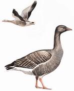描述:体大(76厘米)的灰褐色雁。以粉红色的嘴和脚为本种特征。嘴基无白色。上体体羽灰而羽缘白,使上体具扇贝形图纹。胸浅烟褐色,尾上及尾下覆羽均白。飞行中浅色的翼前区与飞羽的暗色成对比。