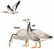 描述:体型略小(70厘米)的雁。顶白而头后有两道黑色条纹为本种特征。喉部白色延伸至颈侧。头部黑色图案在幼鸟时为浅灰色。飞行中上体均为浅色,仅翼部狭窄的后缘色暗。下体多为白色。