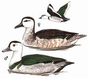 描述:体小(30厘米)的深绿及白色鸭。雄鸟:头顶、颈带、背、两翼及尾皆黑而带绿色;体羽余部近白。飞行时白色翼斑明显。雌鸟:棕褐色取代闪光黑色,皮黄色取代白色;有暗褐色过眼纹;无白色翼斑。