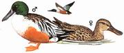 描述:体大(50厘米)而易识别,嘴特长,末端呈匙形。雄鸟:腹部栗色,胸白,头深绿色而具光泽。雌鸟褐色斑驳,尾近白色,贯眼纹深色。色彩似雌绿头鸭但嘴形清楚可辨。飞行时浅灰蓝色的翼上覆羽与深色飞羽及绿色翼镜成对比。