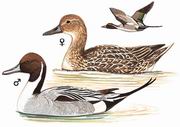 描述:中等体型(55厘米)的鸭。尾长而尖。雄鸟头棕,喉白,两胁有灰色扇贝形纹,尾黑,中央尾羽特长延,两翼灰色具绿铜色翼镜,下体白色。雌鸟黯淡褐色,上体多黑斑;下体皮黄,胸部具黑点;两翼灰翼镜褐;嘴及脚灰色。与其他雌鸭区别于体形较优雅,头淡褐,尾形尖。
