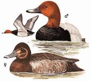 描述:中等体型(46厘米)、外观漂亮的鸭类。栗红色的头部与亮灰色的嘴和黑色的胸部及上背成对比。腰黑色但背及两胁显灰色。近看为白色带黑色蠕虫状细纹。飞行时翼上 的灰色条带与其余较深色部位对比不明显。雌鸟背灰色,头、胸及尾近褐色,眼周皮黄色。
