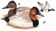 描述:形大(56厘米)的潜鸭。头棕,胸及尾黑色,背部有鞍形灰白色斑块。色型如红头潜鸭,但体大而颈部显长,嘴也更长,头廓特征性高耸。头部近前额及近头顶处渐黑。雌鸟较雄鸟色褐且黯,但胸及体侧的对比度较雌性红头潜鸭明显。