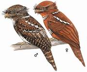 描述:不会错识的中等体型(24厘米),全身褐色、黑色及白色斑驳的鸟种。嘴角巨阔,浅褐色的双眼凝神。体羽为似树皮样的保护色图案。雌鸟较雄鸟多棕色,喉胸部有一由具黑色羽缘的白色羽而成的大型斑块,少斑驳图案。此为中国的唯一一种蟆口鸱。