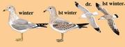 描述:中等体型(45厘米)的鸥。腿及无斑环的细嘴绿黄色,尾白。初级飞羽羽尖白色,具大块的白色翼镜。冬季头及颈散见褐色细纹,有时嘴尖有黑色。第一冬的鸟尾具黑色次端带,头、颈、胸及两胁具浓密的褐色纵纹,上体具褐斑。第二年鸟似成鸟但头上褐色较深,翼尖黑而翼镜??br>虹膜-黄色;嘴-绿黄色;脚-绿黄色。