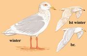 描述:体大(71厘米)而翼白的鸥。腿粉红,嘴黄。看似健猛。背及两翼浅灰色。比中国任何其他鸥的色彩都浅许多。越冬成鸟头顶、颈背及颈侧具褐色纵纹。四年始为成鸟。第一冬鸟具浅咖啡奶色,逐年变淡;嘴粉红而具深色嘴端。