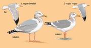 描述:银鸥复合体中体大(62厘米)的灰色鸥。腿粉红色。冬鸟头及颈背具深色纵纹,并及胸部;上体体羽变化由浅灰至灰(birulae)或灰至深灰(vegae)。两者均偏蓝色。通常三级飞羽及肩部具白色的宽月牙形斑。合拢的翼上可见多至五枚大小相等的突出白色翼尖。飞行时于第十枚初级飞羽上可见中等大小的白色翼镜,第九枚具较小翼镜。浅色的初级飞羽及次级飞羽内边与白色翼下覆羽对比不明显。