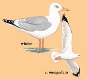 描述:银鸥复合体中体大(60厘米)的鸥。上体浅灰至中灰,腿黄色。冬鸟头及颈背无褐色纵纹。三个亚种细部上有别。亚种cachinnans上体灰色最浅,冬季腿鲜黄至肉色。mongolicus灰色比L. c. cachinnans深,但较L. vegae vegae浅。冬鸟的灰色型与L. vegae birulae大致相同但为白色;三级飞羽及肩羽具白色的宽月牙形斑;翼合拢时通常可见三个大小相同的白色羽尖;飞行时初级飞羽外侧具大翼镜,较越冬的L. vegae birulae或 L. heuglini taimyrensis的翼镜大;腿浅粉红色。越冬的亚种barbensis 色深而体型略小,三级飞羽及肩羽的月牙形斑较窄,外侧两枚初级飞羽具翼镜;腿从粉红至黯淡黄色,但通常为亮丽橙黄色;眼深黄色;看似嘴小而头圆,嘴上有时略具黑色带。