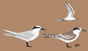 描述:体型略小(31厘米)而非常白的燕鸥。具形长的叉形尾及特征性的枕部黑色带。上体浅灰,下体白,头白,仅眼前具黑色点斑,颈背具黑色带。第一冬鸟头顶具褐色杂斑,颈背具近黑色斑。幼鸟:头侧及颈背灰褐,上体近褐而具皮黄及灰色扇贝形斑,腰近白,尾圆而无叉。