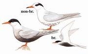 描述:中等体型(33厘米)栖于河流的燕鸥。尾深开叉。头顶黑色,嘴及腿橙红色。上体、腰及尾浅灰,下体白,腹部具特征性黑色块斑。冬季成鸟嘴端黑色,额具白色杂斑,腹部黑色块缩小或消失。与黄嘴河燕鸥的区别在体型较小,上体色淡,腹部黑色,嘴细,飞行轻盈。