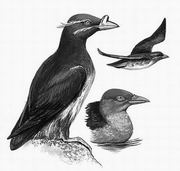 描述:体型略大(32厘米)的暗污色海雀。嘴橘黄或黄色,头部具两道特征性白色条纹,脚黄色。上体具灰色横斑及杂斑。繁殖羽的明显特征为眼后的白色眉纹及眼下的白色髭纹。嘴及脚的橘黄色较浓,上颚基部具一小的浅色角状物,角嘴海雀因此得名。