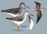 描述:中等体型(31厘米)的灰色鹬。腿偏黄,嘴呈双色。非常似青脚鹬,但头较大;颈较短较厚;嘴较粗较钝且基部黄色;上体色较浅,鳞状纹较多,细纹较少(冬季),尾部横纹色较浅;腿相对较短,黄色较深;飞行时脚伸出尾后较短,叫声也不同。拿在手上能看见三趾间连蹼,青脚鹬仅有两趾连蹼。