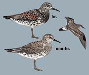 描述:体型略大(27厘米)的长嘴近灰色鹬。似红腹滨鹬但略大,嘴较长且厚,嘴端微下弯;上体色深具模糊的纵纹;头顶具纵纹;非繁殖期胸及两侧具黑色点斑(远处看似深色的胸带);腰及两翼具白色横斑。春夏季的鸟胸部具黑色大点斑,翼具赤褐色横斑。