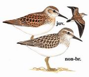 描述:体小(17厘米)的滨鹬。上背具棕色鳞状纹,头顶具棕色条纹。下体白色,胸及两胁具箭头形粗纵纹。冬羽棕色消失,下体几全灰褐,仅上胸沾灰。飞行时尾上覆羽全白(但腰为灰色!)。嘴短而略下弯。