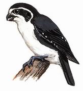 描述:体型微小(15厘米)的黑白色隼。特征为喉、腿、臀及尾下棕色。顶冠及背黑而颈背白,自眼部有黑色带延至耳羽后,尾下具黑白色横斑。亚成鸟喉白,额及眉线棕色。