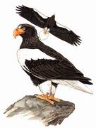 描述:体型硕大(100厘米)的黑色海雕雕。特征为黄色的嘴特大,翼上覆羽、腰、臀及楔尾均白。亚成鸟深灰褐色,尾近白,边缘灰色,翼上有浅色斑纹。似白尾海雕雕但黄色的嘴特大。