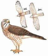 描述:中等体型(45厘米)的偏褐色鵟鹰。颏及喉为明显白色,具黑色的顶纹及髭纹。头侧近黑;上体褐色,具近黑色的纵纹及横斑;胸褐色而具黑色细纹。下体余部具棕色横斑而有别于白眼鵟鹰。尾细长,平型。