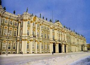 19世纪中叶,当时的俄国有一项特别的法律规定,圣彼得堡市所有的建筑物,除教堂外,都要低于冬宫。冬宫面向涅瓦河,中央稍为突出,有3道拱形铁门,入口处有阿特拉斯巨神群像。宫殿四周有两排柱廊,气势雄伟。宫内以各色大理石、孔雀石、石青石、斑石、碧玉镶嵌;以包金、镀铜装璜;以各种质地的雕塑、壁画、绣帷装饰;色彩缤纷,气派堂皇。十八世纪下半叶,俄国女皇叶卡婕林娜二世在位时,曾下令拨出一部分房子用来收藏世界著名艺术珍品,并把这些房子称作“埃尔米达日”(隐宫),后来随着收藏品不断增多,于1764至1789年间又先后建了小埃尔米达日和大埃尔米达日。