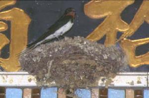 巢多置于人类房舍内外墙壁上、屋椽下或横梁上,甚至在悬吊着的电灯头上筑巢。筑巢时雌雄亲鸟轮流从江河、湖泊、沼泽、水田、池塘等水域岸边衔取泥、麻、线和枯草茎、草根,再混以唾液,形成小泥丸,然后再用嘴从巢的基部逐渐向上整齐而紧密地堆砌在一起,形成一个非常坚固的外壳。然后用3-5天的时间衔取干的细草茎和草根,再用唾液将它们粘铺于巢底,形成一个干燥而舒适的内垫,最后再垫以柔软的植物纤维、头发和鸟类羽毛。