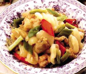 材料:荔枝300克、鸡胸肉200克、葱2根、青、红椒各1/2个。