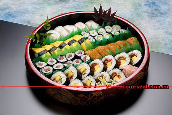 寿司是在饭里放醋做主材料的日本料理,味道鲜美,很受日本民众的喜爱。寿司和其他日本料理一样,色彩非常鲜明。制作时,把新鲜的海胆黄、鲍鱼、牡丹虾、扇贝、鲑鱼籽、鳕鱼鱼白、金枪鱼、三文鱼等海鲜切成片放在雪白香糯的饭团上,一揉一捏之后再抹上鲜绿的芥末酱,最后放到古色古香的瓷盘中……如此的色彩组合,是真正的“秀色可餐”。