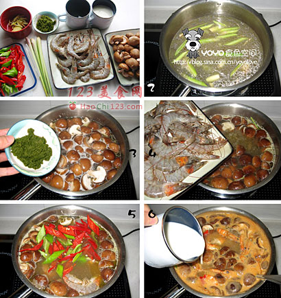 3、怎样轻松做出美味的冬阴功汤(TomYamKung)呢?只要先备齐材料,再按以下步骤操作,就可以轻松DIY了。关于做冬阴功汤(TomYamKung)的咖喱,最好用绿咖喱,绿咖喱酱由于用了芫荽和青柠皮等材料,所以呈现出青绿色。添加椰酱来减低辣味和增强香味,而额外加入的香茅、鱼露、月桂叶等香料,让绿咖喱风味更独特,也正是因为这多种香料的搭配,才成就了泰国的国汤:冬阴功汤。