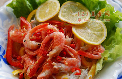 5、将粉丝、虾仁、柠檬片、甜椒丝等混合,淋入调好的味汁,混合均匀即可食用。