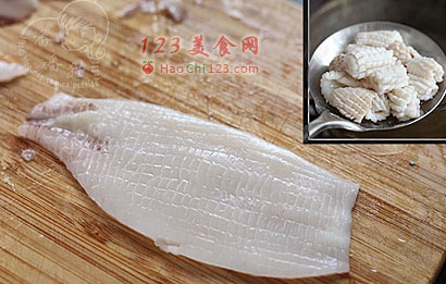 4、在鱿鱼身上用刀均匀的切出小“格子”,但是不能切断,然后切成大片后用开水焯一下,打卷后就捞出。切鱿鱼卷我觉得没有什么窍门,就是需要一把比较锋利的刀和耐心。