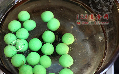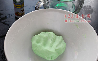 14、还有点时间为,做个带点东南亚风格的甜品吧,在清水里加入香兰草的浓缩汁,然后用绿色的水来和糯米粉。