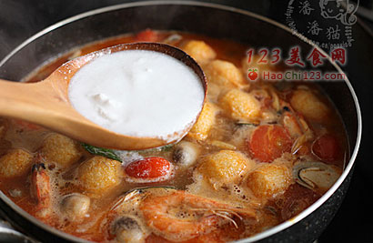 13、临出锅前调入椰浆就可以了。把煮好的冬阴功汤盛入锅仔中,上面撒些香草,等阿呆回来在点火。