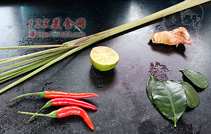 5、用来做冬阴功汤的香料,提升香气的南姜、香茅、柠檬叶子。酸的来源:青柠檬;辣的来源:小米辣;其实,在市场上买的“冬阴功酱TomYampaste”已经有酸味喝辣味了,不过我是重口味,所以又加了青柠檬和小米辣。