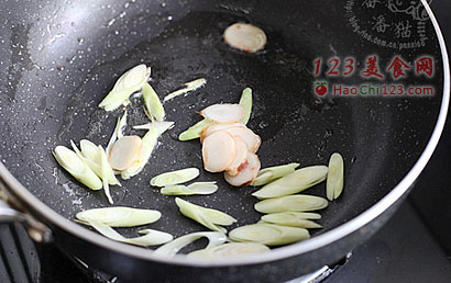 7、准备工作做得差不多了,炉灶上做锅,锅微热后倒入少量的油,烹入香茅片和南姜片翻炒一下。