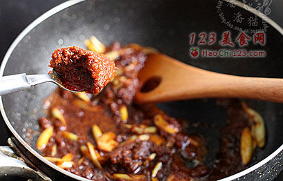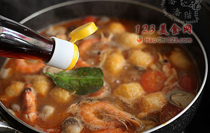 12、汤煮开后尝一下味道,用鱼露来调节咸味,放入一勺糖调味。